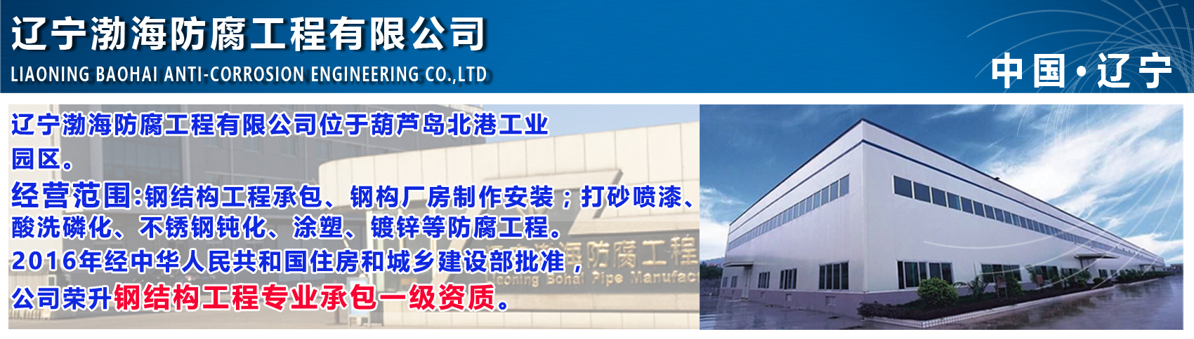 遼寧渤海防腐工程有限公司是一家集各種大型橋梁、鋼結(jié)構(gòu)工程制作、橋式、門式起重機(jī)制造、船體分段制作、礦山設(shè)備制造、環(huán)保設(shè)備研發(fā)制造、大型金屬涂塑、防腐處理等多元化機(jī)械裝備制造公司,2013-2016年公司連獲《國家高新技術(shù)企業(yè)》稱號(hào)。 Liaoning Bohai Anti-corrosion Engineering Co., Ltd. is a collection of large-scale bridges, steel structure engineering, bridge, gantry crane manufacturing, hull segment production, mining equipment manufacturing, environmental equipment R & D and manufacturing, large metal coating, anti-corrosion treatment, etc. Chemical machinery equipment manufacturing company, the company won the title of "National High-tech Enterprise" in 2013-2016. 公司2017年榮升鋼結(jié)構(gòu)工程專業(yè)承包壹級資質(zhì),可承攬各類大型鋼結(jié)構(gòu)及網(wǎng)架工程制作、加工、安裝;同時(shí)具有橋式起重機(jī)(C)制造、改造、安裝、維修資質(zhì);公司可承接各類金屬表面防腐處理工程業(yè)務(wù)(酸洗、磷化、打砂、涂塑)。