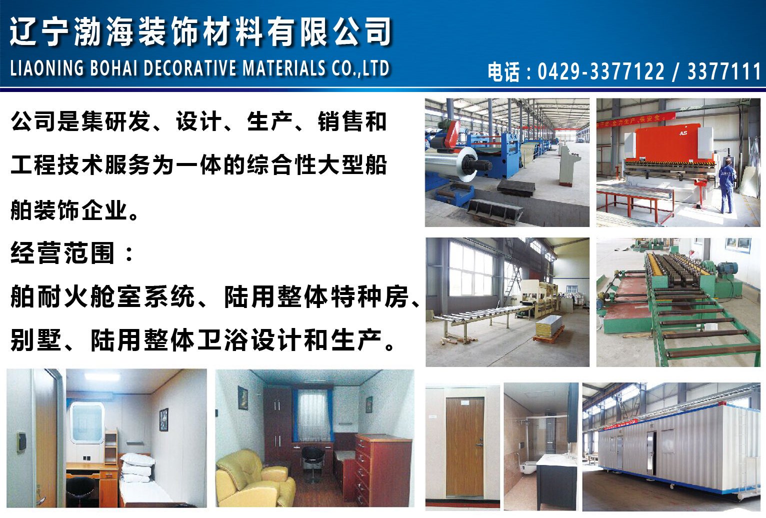 Liaoning Bohai Decoration Materials Co., Ltd. is located in Beigang Economic Development Zone, Huludao City, Liaoning Province. It is the first professional manufacturer in the north of China to produce fireproof door interior decoration materials such as ship metal composite rock wool board fire door sanitary unit. In the ultra-clean workshops such as ship interior decoration engineering and terrestrial medicine laboratory, the production capacity of marine rock wool board reaches 600,000 square meters per year, the annual production capacity of marine fire doors is 3,000 sets per year, and the production capacity of marine sanitary units is 500 sets per year. The products have been approved by many classification societies including the Norwegian Classification Society, the Lloyd's Register of Shipping, the American Bureau of Shipping, the French Bureau of Shipping, the Korean Classification Society, the China Classification Society and the European Union. The main production equipment and production line have steel plate unwinding machine roll forming machine plate cutting machine sandwich slat cutting machine plastic processing production line, spray glue bonding curing production line, fire door production line sanitary unit production line, can meet all kinds of ship decoration and land Construction requirements for related projects.